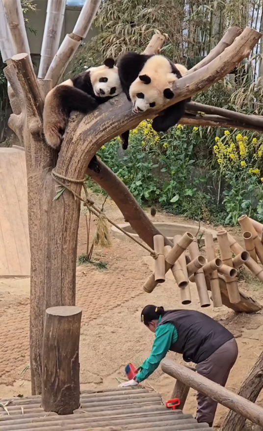 어느 날 루이바오는 나무 위에서 편히 쉬고 있었는데요. 밥을 맛있게 먹고 소화가 된 참인지, 하필이면 아래에서 청소를 하던 오바오 이모의 머리 위로 실례를 해버리고 말았습니다. 이모는 잠시 당황했지만 이내 다시 청소를 이어갔는데요.