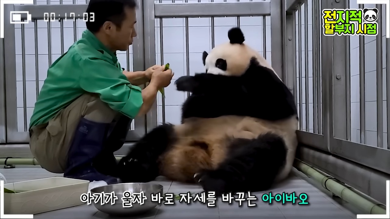 강바오가 먹이를 주려고 시도했지만 아이바오는 먹고 싶지 않았나 봅니다. 아기가 울기 시작한 상황이었기 때문이죠.