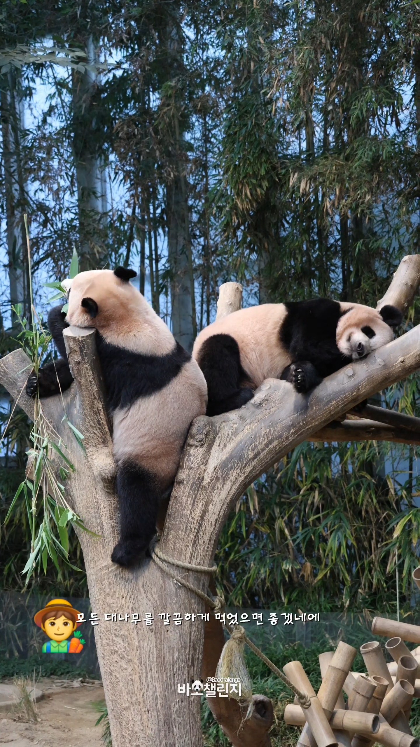 이날도 평소처럼 사육사들은 판다들에게 싱싱한 대나무를 준비해주었어요. 먹이를 맛있게 다 먹은 후이바오를 보며 강바오는 이렇게 말했지요. 이 모습은 바오 팬 @baochallenge님의 카메라에 담겼습니다.