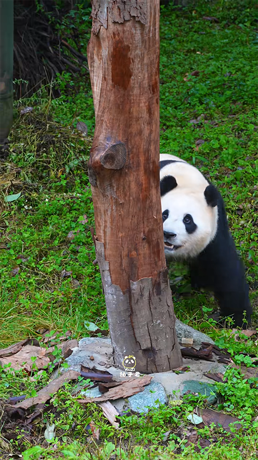 땅에 발을 디딘 푸바오는 나무껍질을 손에 꼭 쥔 채 나무를 한 번 올려다보았습니다. 그러고는 등을 돌려 떠났습니다.