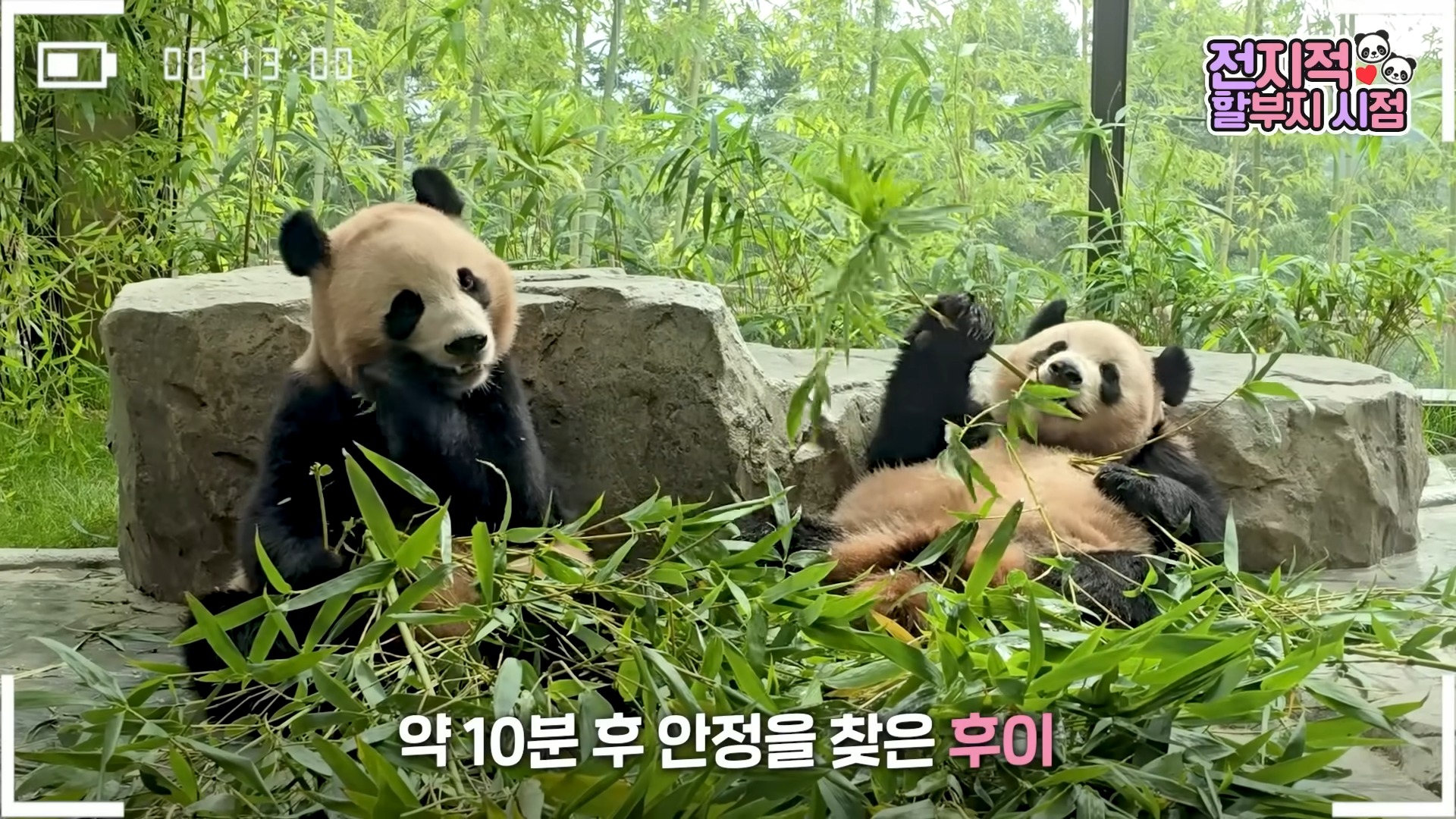 기특한 변화는 3일차에 일어났어요. 아직 낯선 듯 내실로 들어가고 싶어하는 후이와 달리 루이바오는 이미 정복을 끝내고 맛있게 밥을 먹고 있었습니다. 기대라고 만들어준 바위를 똑부러지게 활용하며 대나무를 먹는 루이바오를 보며 강바오는 “후이도 언니 보고 배울 거다”라고 말했는데요. 정말로 얼마 지나지 않아 편안하게 대나무를 먹는 루이 옆에서 후이도 긴장을 풀고 밥을 먹기 시작했습니다.