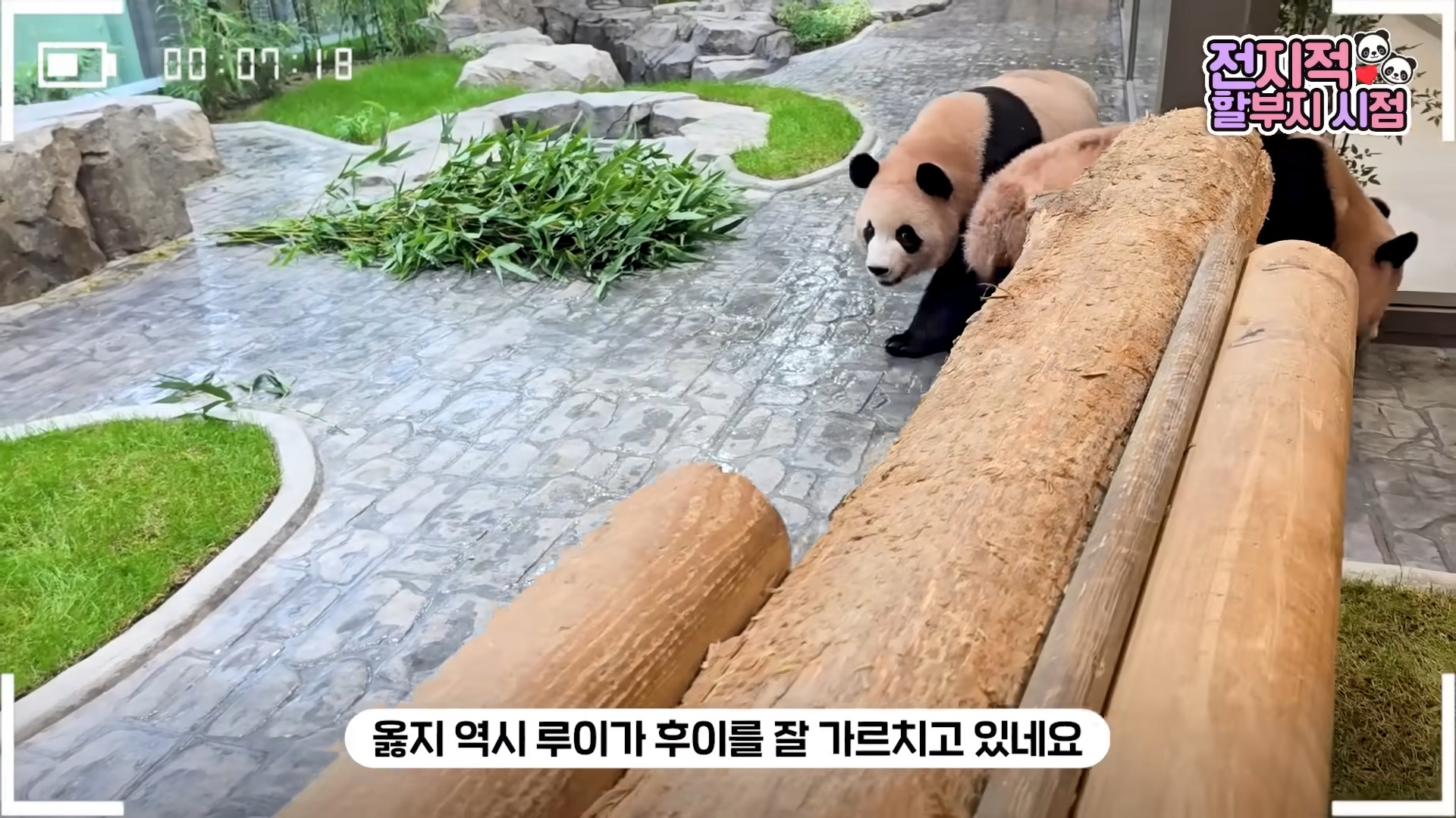 루이바오는 한 번 탐색을 마친 후 동생 후이바오를 데리고 나왔습니다. 가벼운 발걸음으로 걷는 루이를 보며 강바오는 “옳지, 역시 루이가 후이를 잘 가르치고 있다”고 칭찬했습니다. 언니 덕분에 후이도 겁내지 않고 언니도 못 들어가봤던 동굴(야외 방사장 연결 통로)까지 탐색할 수 있었습니다.